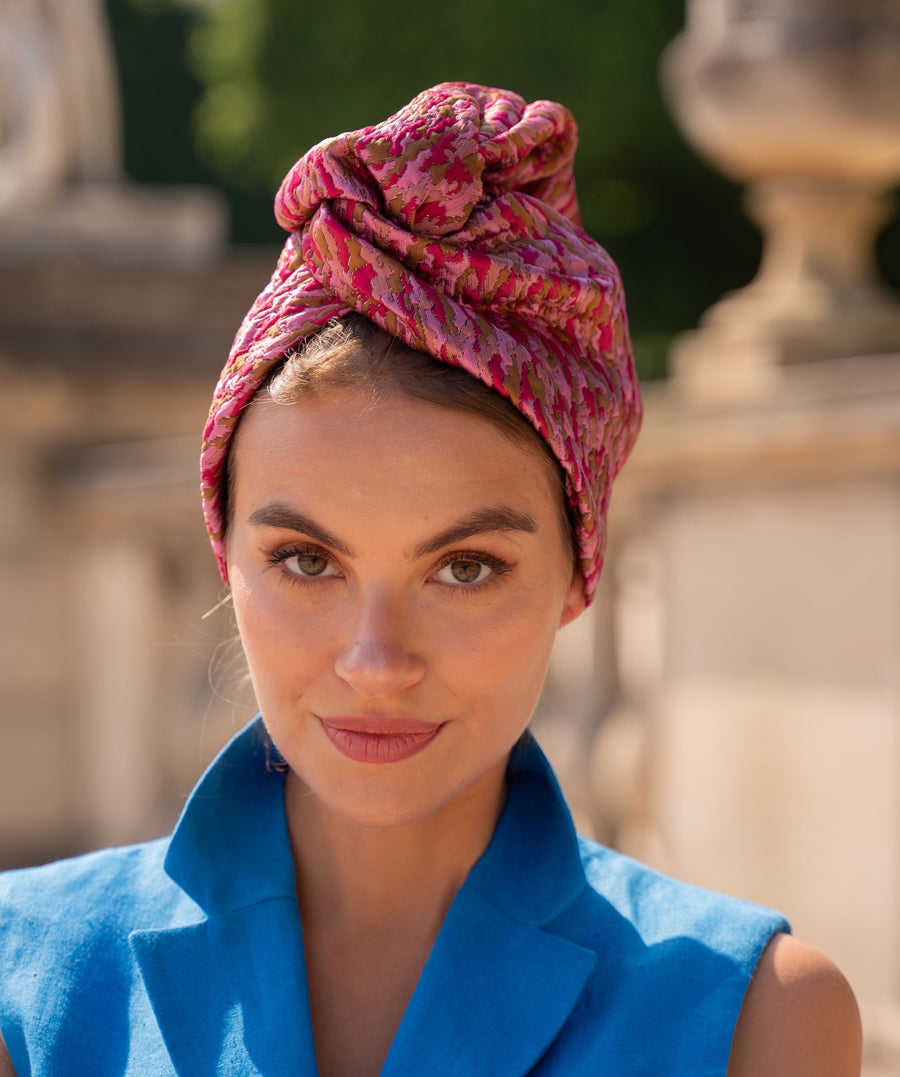 Pièce unique, Turban Jacquard Alma L recouvre toute la tête pour un confort absolu et une élégance intemporelle.