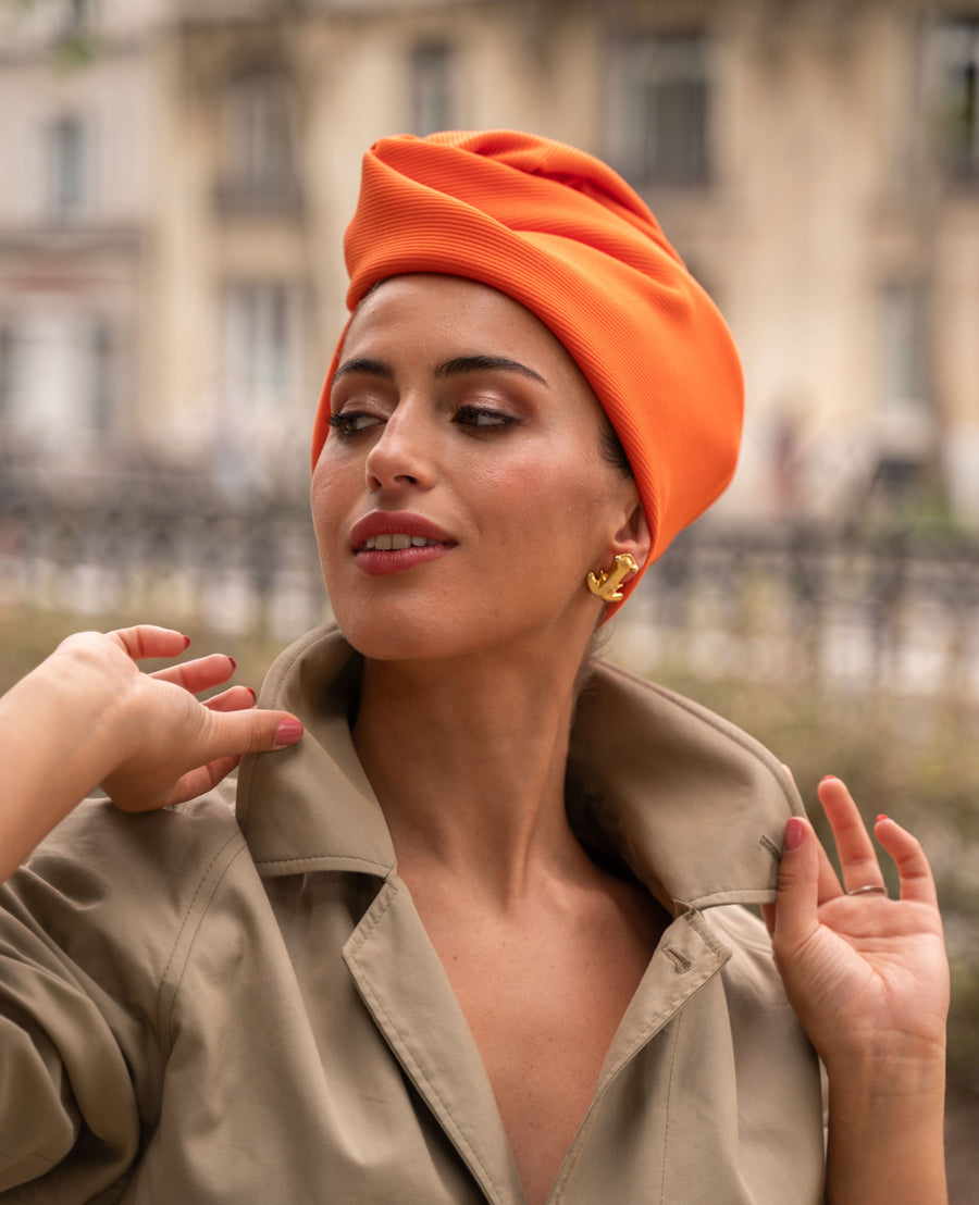Le turban Jacquard Orange Épais se présente comme une pièce maîtresse.